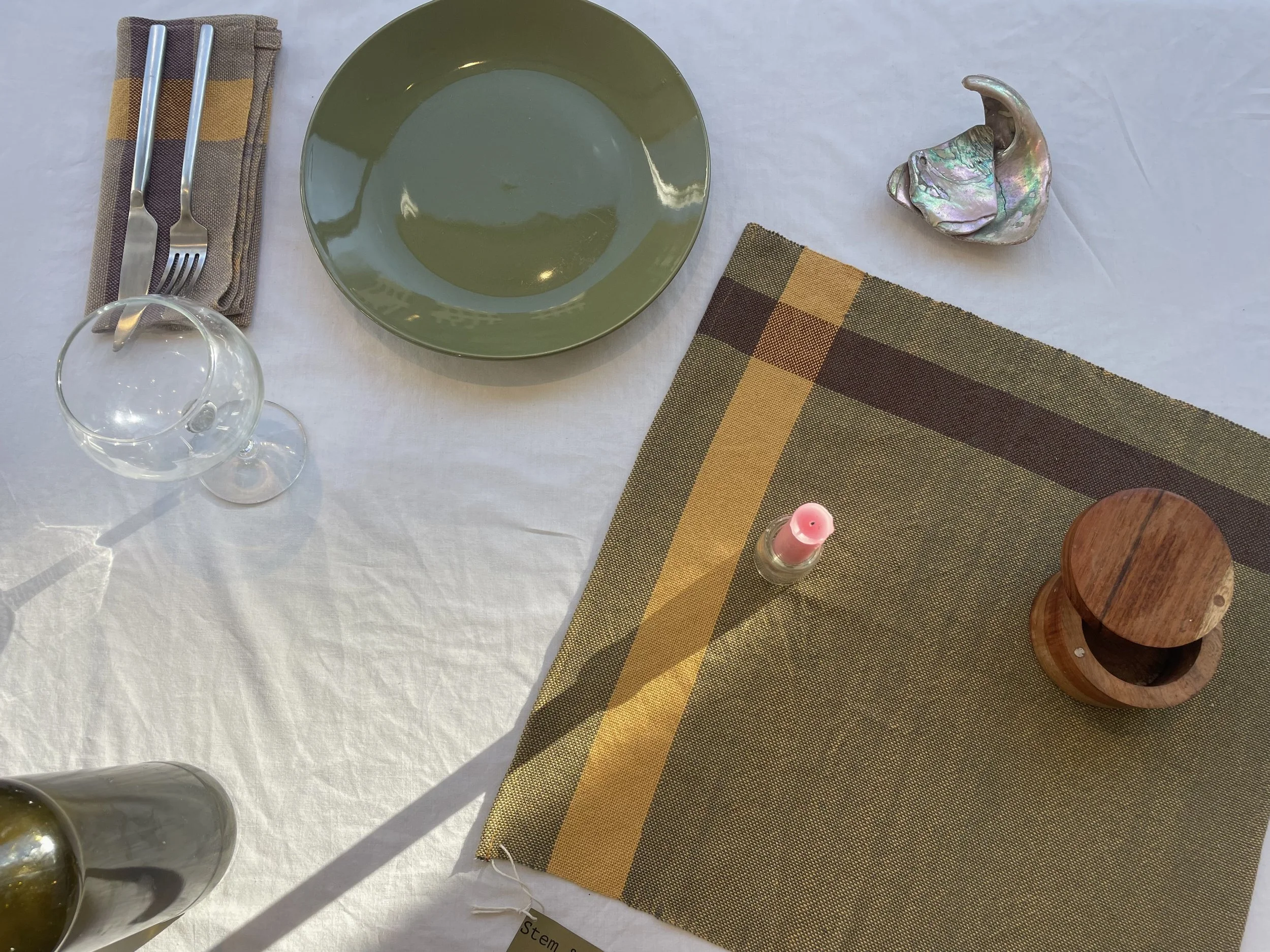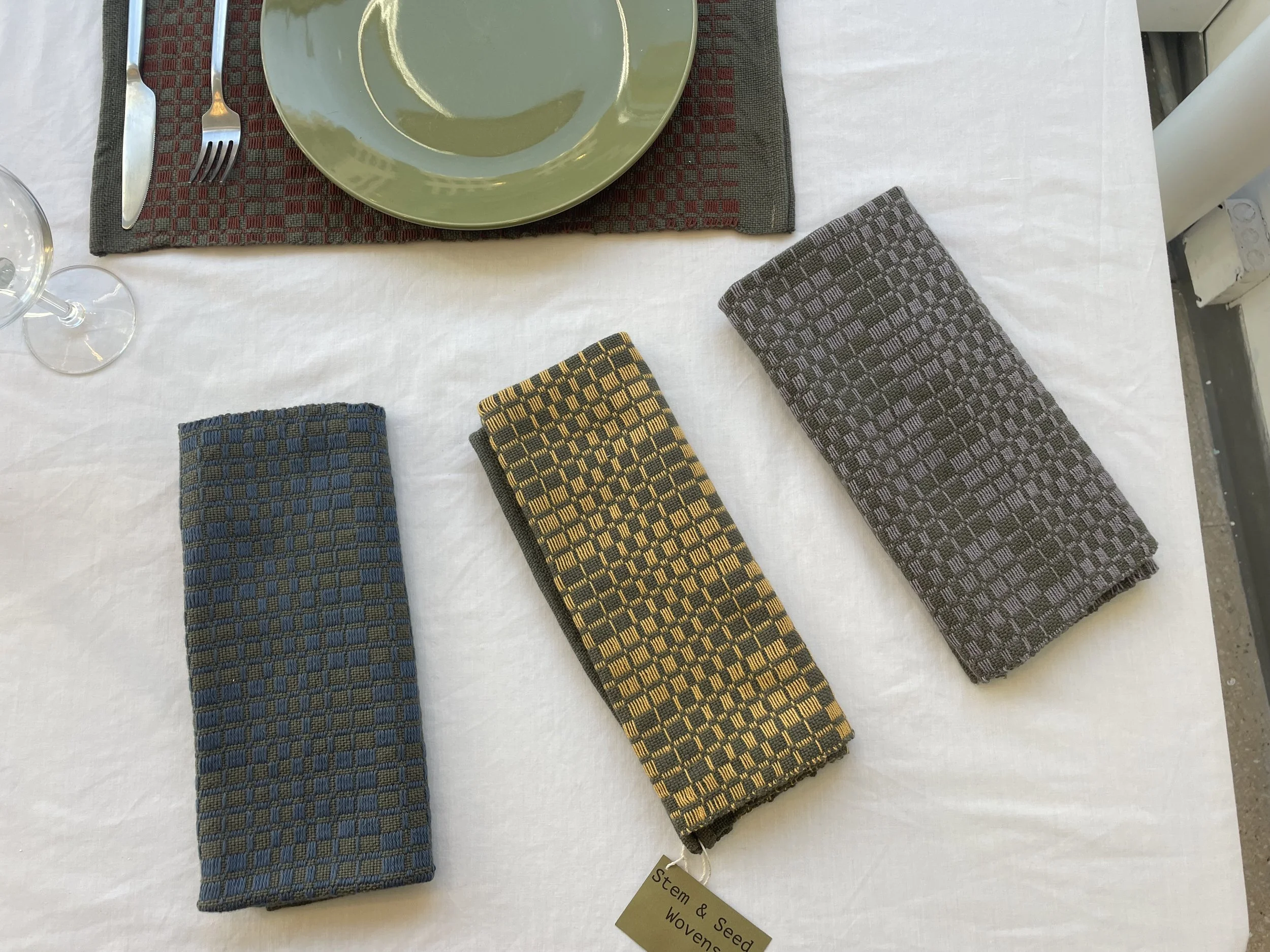 Slide 1 Slide 1 (current slide) Slide 2 Slide 2 (current slide) 2024 Cotton yarn 19” x 21” Overshot Napkins / Stripe Napkins